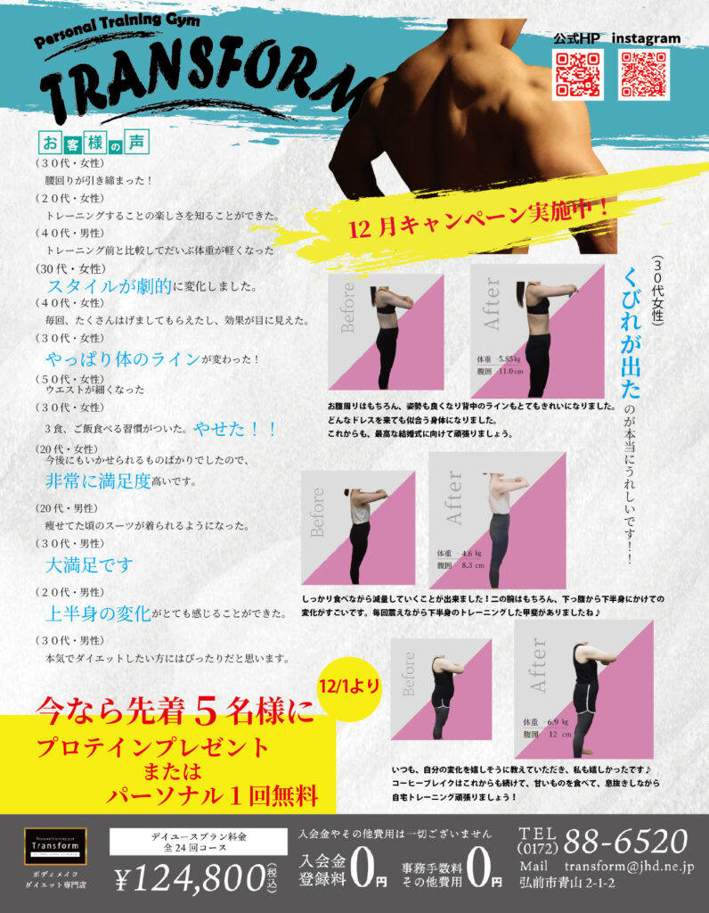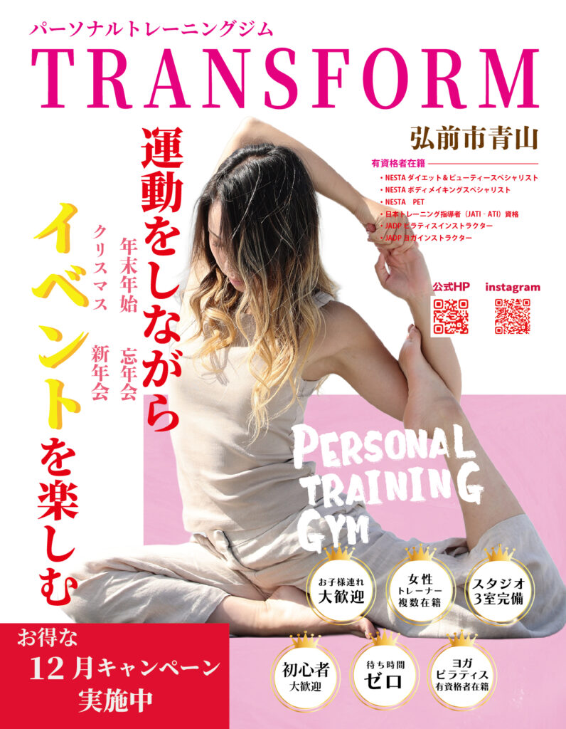 弘前のフィットネススタジオ&ジム トランスフォームでは、スポーツトレーナーおよびヨガ&ピラティス有資格者などの精鋭トレーナー陣が皆様のダイエット&ボディメイクをお手伝いいたしております。