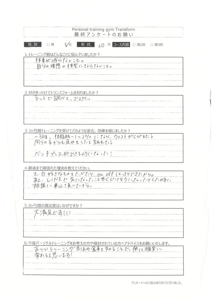 -3Kg、体脂肪-1~2%になり、ウエストがくびれた!周りの子からも足やせしたと言われた!