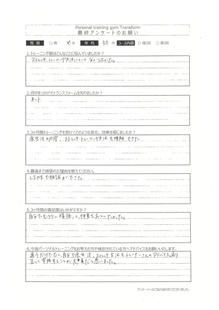 通うだけでなく、自分で食生活、ストレッチ方法をトレーナーさんのアドバイス通り正しく実施することが大事だと思いました。